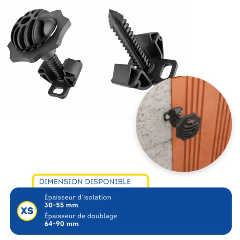 - Appui intermédiaire 100 % réglable pour doublages thermo-acoustiques sur ossature métallique.