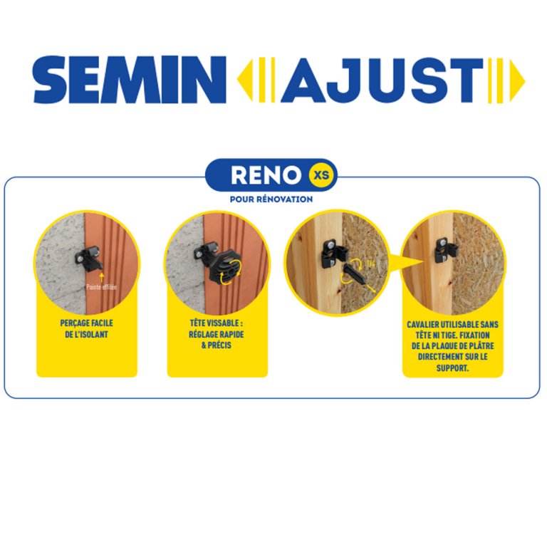 Conçu pour la réalisation de doublages thermo-acoustiques des murs sur ossature métallique, AJUST Réno XS est un appui intermédiaire 100 % réglable pensé pour les chantiers de rénovation. Sa petite taille permet de réaliser des cloisons minces en murs intérieurs, tout en conservant un maximum d’espace et en facilitant la pose sur les supports existants.