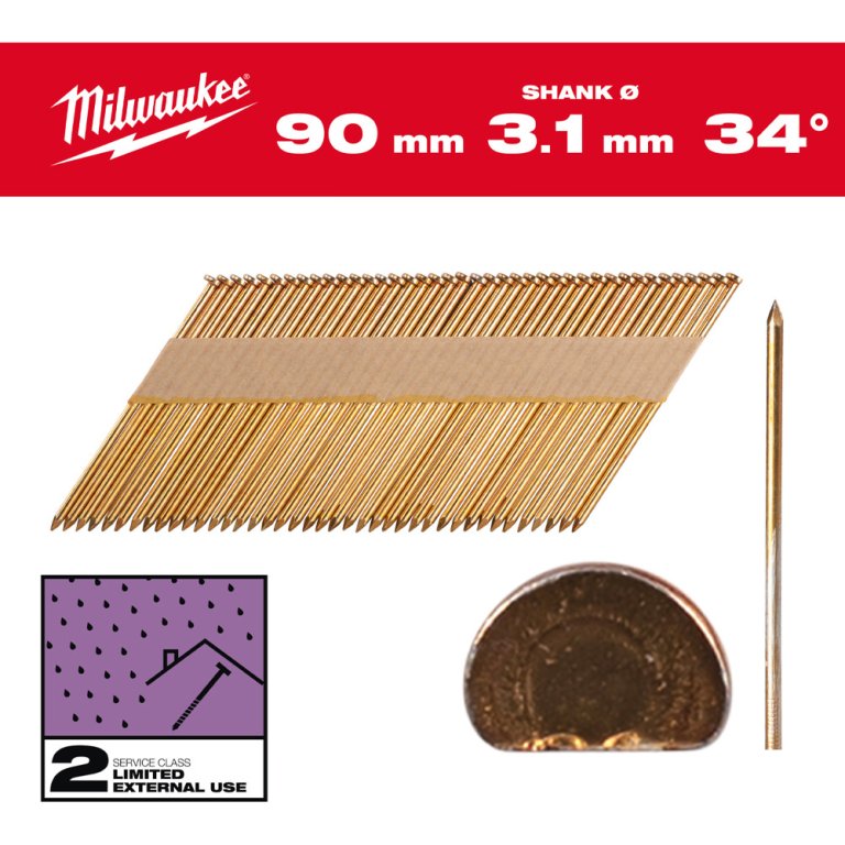 Clous de charpente tige lisse galvanisés SC2 34°, tête D, 90 mm x 2200, par le fabricant Milwaukee.