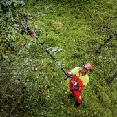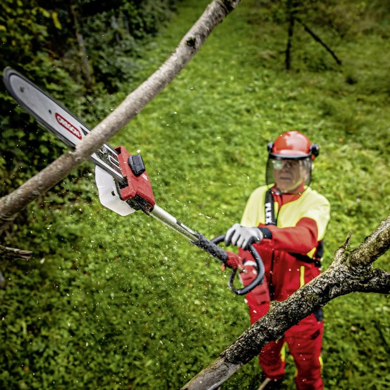 Le guide de 25 cm associé à une vitesse de chaîne de 13 m/s permet de couper sans difficulté des branches jusqu’à environ 20 cm de diamètre. L’élagueuse sur perche intègre également un système de lubrification automatique avec réservoir d’huile de 120 ml, afin de maintenir un fonctionnement fluide de la chaîne pendant le travail.