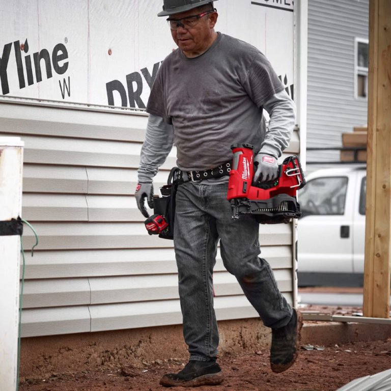 La plateforme M18 Fuel™ associe moteur sans charbon, électronique de gestion et batteries Milwaukee M18™ pour offrir une machine autonome et endurante. Avec une batterie Redlithium™ M18 HB3, ce cloueur peut atteindre jusqu’à 1100 clous d’autonomie, ce qui contribue à maintenir un bon rendement sur les travaux de couverture.